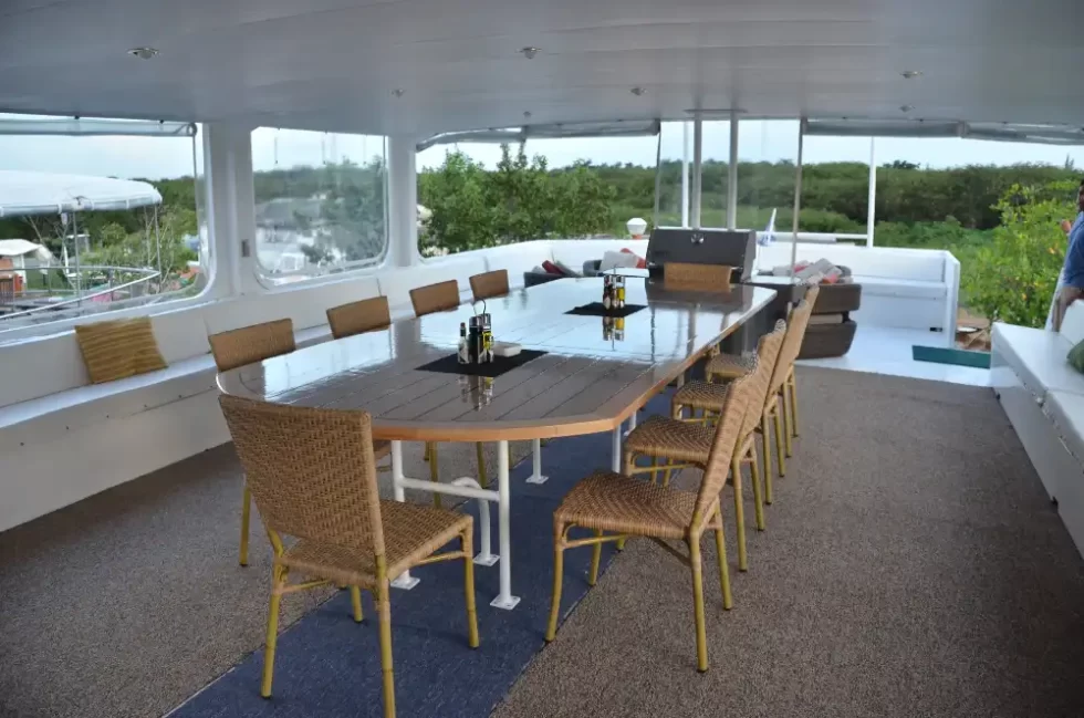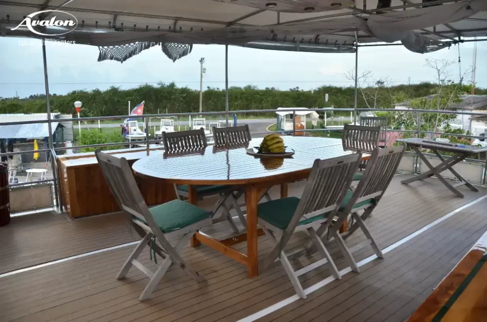 Jardines Avalon F I has 8 deluxe king cabins, with 7 private bathrooms. Each room includes air conditioning and heat controls, electricity plugs, as well as storage in drawers. Each room has panoramic windows to enjoy the breathtaking view of the Caribbean beaches. There is a spacious and comfortable combination lounge, dining room and bar area on the boat deck. In cabins and common areas there are electric sockets available for you to plug in your personal items (220 volts and 110 volts).